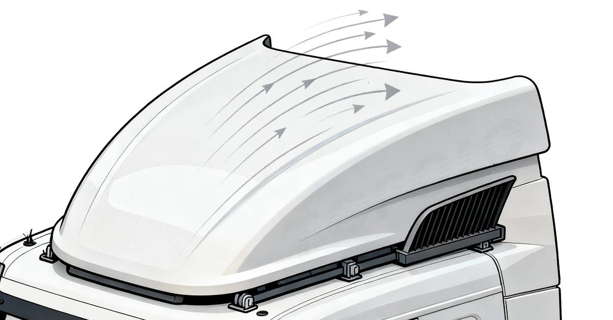 Des études scientifiques montrent que la résistance à l’air augmente avec le carré de la vitesse du véhicule, ce qui signifie que la réduction de la traînée à haute vitesse permet de réaliser d’importantes économies de carburant. Outre une aérodynamique améliorée, le déflecteur d’air protège également le toit de la cabine des rayons directs du soleil, offrant ainsi un avantage secondaire en termes d’isolation thermique et de confort pour le conducteur.